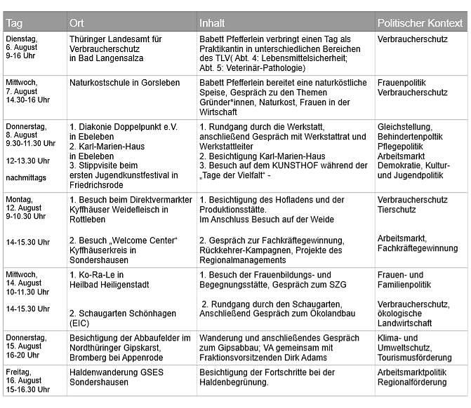 Für mich persönlich gehört zum guten Leben eine intakte Umwelt, gesundes Essen sowie gleiche Chancen für alle Menschen und eine gute Arbeitsstelle. Ich werde während meiner Tour an ganz unterschiedlichen Stationen einen Stopp einlegen: So absolviere ich ein eintägiges Praktikum im Landesamt für Verbraucherschutz in Bad Langensalza, ich besuche den Diakonieverein in Ebeleben und ein Welcome-Center oder erkundige mich nach den Fortschritten bei der Begrünung der Kailabraumhalde bei Sondershausen, erklärt Babett Pfefferlein. Die Themen ökologischer Landbau, Frauenpolitik und der Arbeitsmarkt werden während der Tour ebenso zur Sprache kommen wie kulturelle Angebote im ländlichen Raum und der Gipsabbau in Nordthüringen.
