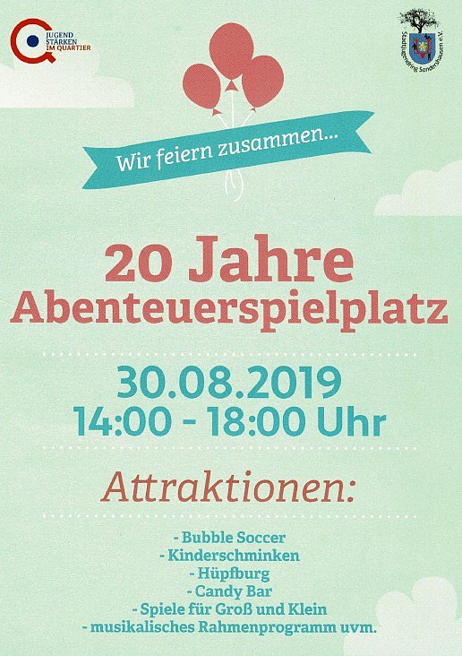 Deshalb würden wir uns freuen viele Besucher am Freitag, den 30.08.2019 in der Zeit zwischen 14 Uhr und 18 Uhr auf dem Abenteuerspielplatz begrüßen zu können