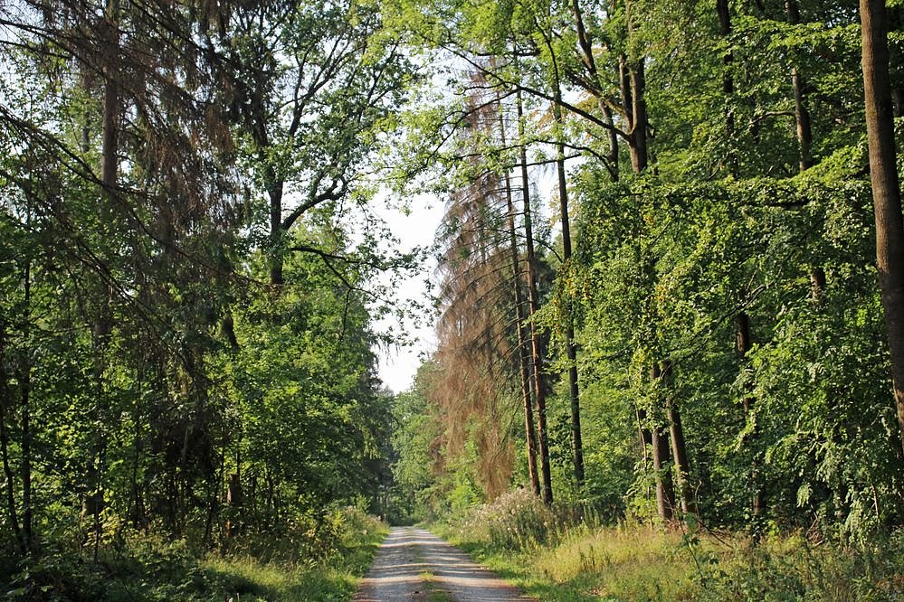 Und immer öfter sieht man Bäume schon am Wegesrand die vertrocknen. Auf der Fahrt zur Mutterblutbuche hatte kn den Weg über den Rohrteichrundweg gewählt.