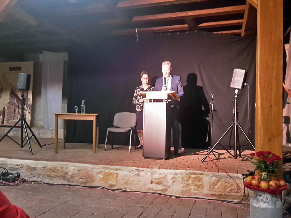 Der Sparkassenvorstandsvorsitzende Markus begrüßte die zahlreichen Gäste (über 200) im Saal, sprich ehemaliger Ochsenstall. Er wies nochmals auf die schöne Tradition dieser Veranstaltung hin, die immer am Vortag des Tags des offenen Denkmals stattfindet. Zusätzlich zu den Gästen war auch der Verwaltungsrat der Kyffhäusersparkasse eingeladen worden. Biere dankte der Sparkassen-Kulturstiftung für die Unterstützung, die diser Veranstaltung zu Teil wurde. Biere begrüßte den 2. Beigeordneten Dietmar Strickrodt (Die Linke) der in Vertretung von Landrätin Antje Hochwind-Schneider (SPD) an an der Veranstaltung teil. Unter den Gästen und immer wieder gern hier, Dr. Michael Grisko von Sparkassen-Kulturstiftung Hessen-Thüringen.