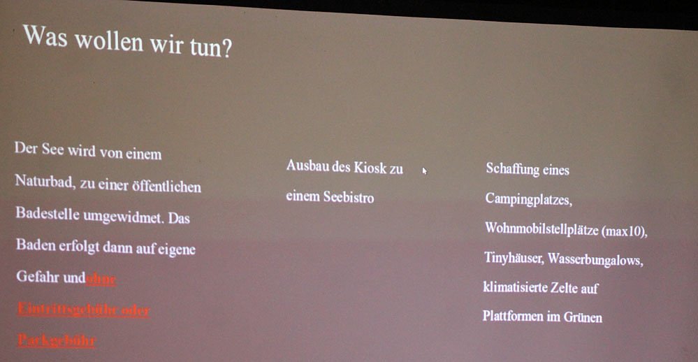 Damit wegen des Campingplatzes nicht zu viel Platz am Teich verloren geht, soll sogar ein Teil des Parkplatzes begrünt und dann als Campingplatz genutzt werden. Das machen wir mit eigenen Mitteln, so Jahn. Es soll aber kein Großcampingplatz werden.