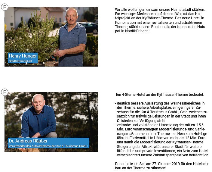 - zeitnahe und vollständige Umsetzung der mit ca. 15,5 Mio. Euro veranschlagten Modernisierungs- und Sanierungsmaßnahmen in der Therme; ein Nein zum Hotel gefährdet Fördermittel in Höhe von mehr als 12 Mio. Euro und damit die Modernisierung der Kyffhäuser-Therme