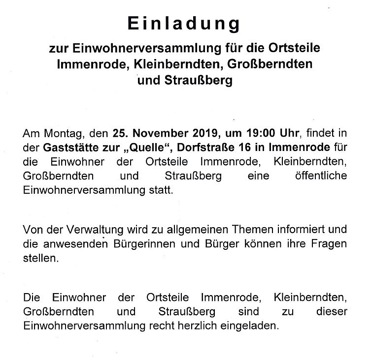 Die Sitzung findet am 25. November 2019, ab 19.00 Uhr, in der Gaststätte "Zur Quelle Immenrode statt.
