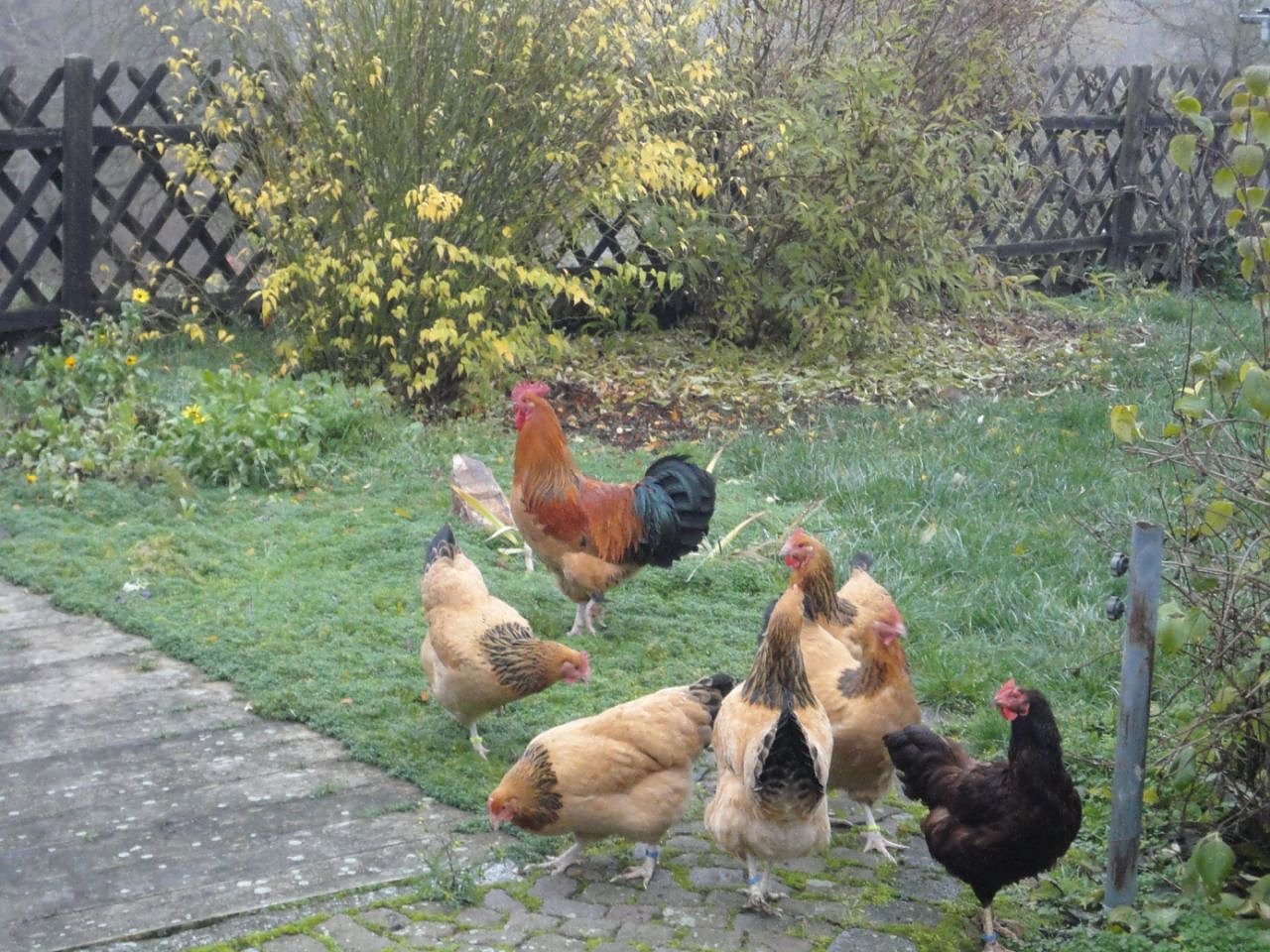 Bild: Hühnerrasse: Sussex gelb schwarzcolumbia, groß (und ein Braunleger)
