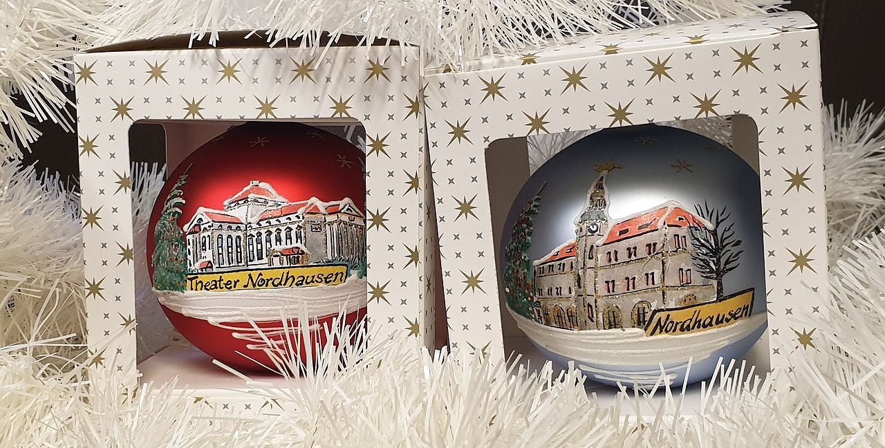 Soeben erreichte uns die Meldung, dass die mundgeblasenen und handbemalten Weihnachtskugeln mit dem Rathaus- und Theatermotiv heute Abend bei der Evita-Musical-Premiere am Stand vom Förderverein des Theaters Nordhausen angeboten werden.