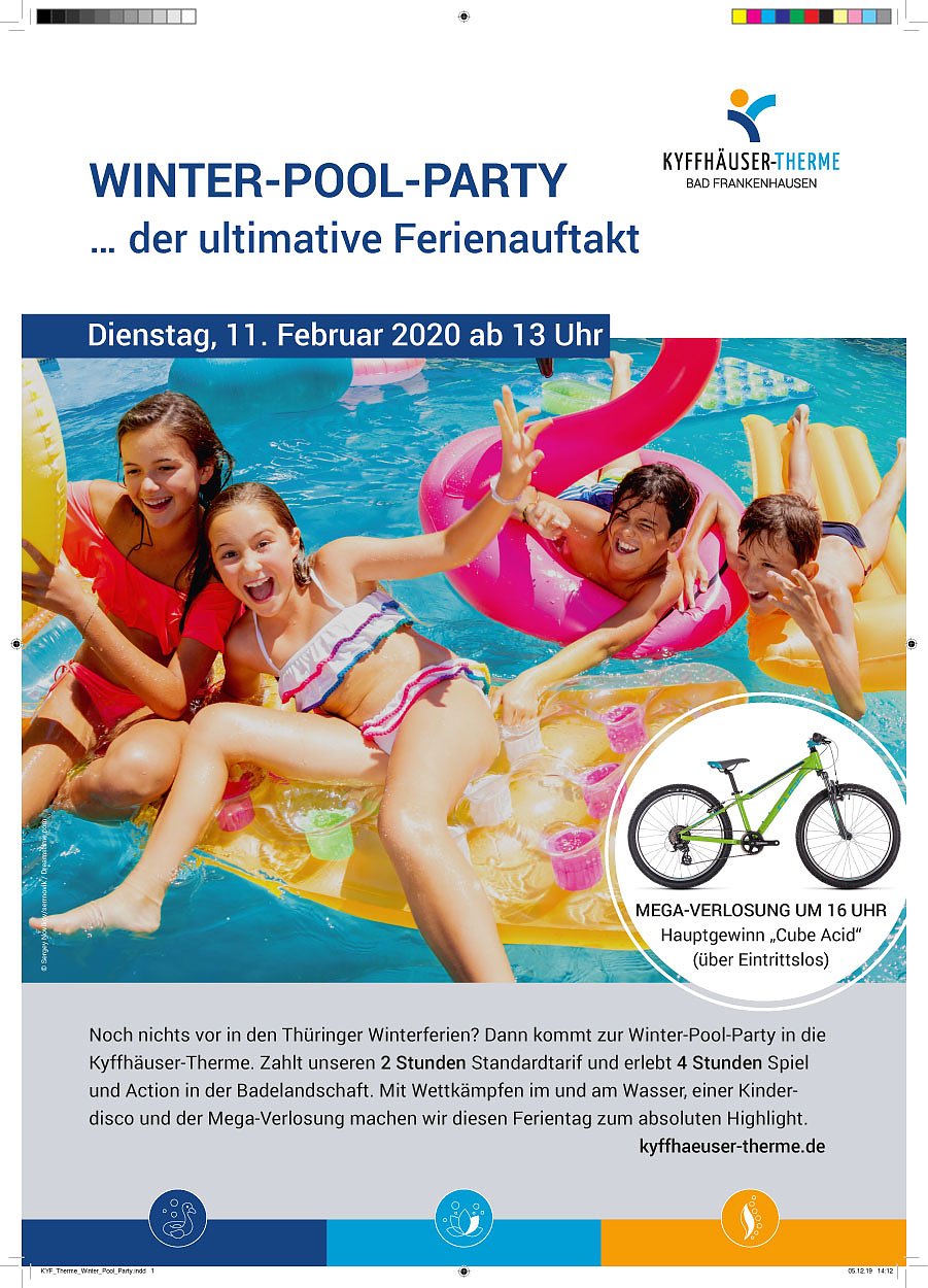 Die Winter-Pool-Party startet am 11. Februar 2020 in der Kyffhäuser-Therme in Bad Frankenhausen. Alle Ferienkinder sind zwischen 13 und 17 Uhr herzlich eingeladen, die Badelandschaft der Therme unsicher zu machen. Es gilt der Tarif vier Stunden bleiben, zwei Stunden zahlen. Voranmeldungen sind nicht erforderlich.