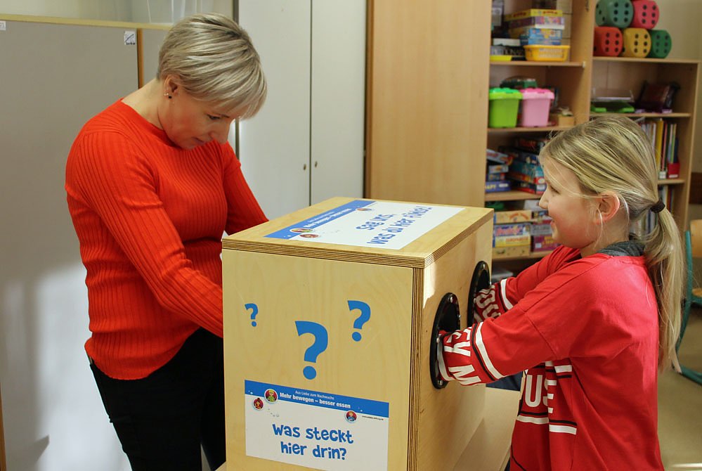 Aber nicht nur um den Geschmack ging es. Bei diesem Spiel galt es mit den Händen zu fühlen, was habe ich da für Lebensmittel in der Hand. Und es galt nicht nur den Namen zu nennen, sondern man musste auch noch richtig zuordnen, ist es Obst und Gemüse. Aber hier lagen fast alle richtig.