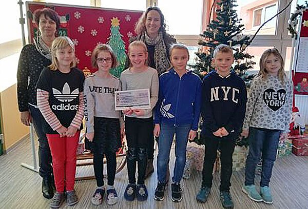 Geldübergabe in Bad Frankenhausen (Direktorin der Kurstadt-Grundschule Frau Schröter, Klassensprecher*innen der 3. und 4. Klassen, Migrationsbeauftragte des Landratsamtes Kyffhäuserkreis Frau Ziegner)