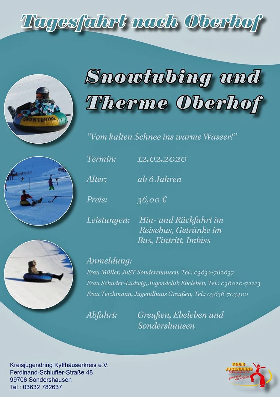 Vom kalten Schnee ins warme Wasser heißt es beim Winterferienausflug des Kreisjugendring´ am 12.02.20. Mit dicker Skikleidung geht es zum Riesen-Reifen-Rutschespaß auf die Snowtubing-Bahn in Oberhof - wo es sitzend oder liegend den 250 Meter langen Hang hinuntergeht. Ein großer Schneespaß für Kinder und Jugendliche. Nach mehrmaligem Fahren und einem gemeinsamen Mittagssnack steht der zweite tolle Programmpunkt des Tages an: ein Besuch der H2Oberhof-Therme. Hier ist Badespaß ist garantiert. Kinder ab 6 Jahren können an der Tagesfahrt teilnehmen. Die Kosten belaufen sich auf 36 €. Wer dabei sein will, sollte sich schnell anmelden – denn die Plätze im Bus sind begrenzt.