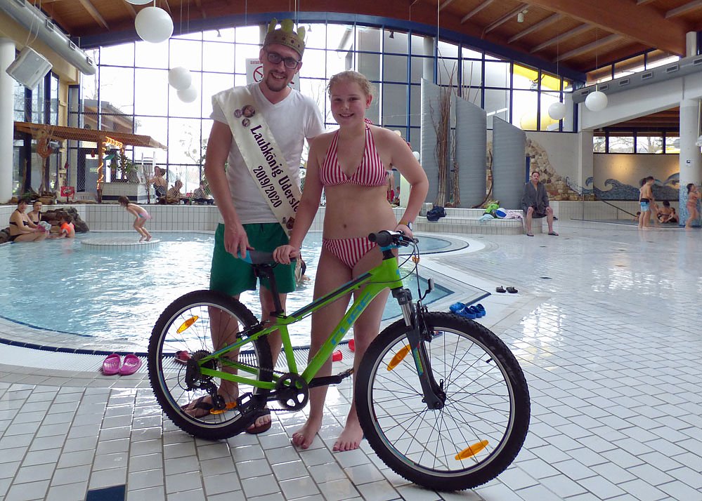 Die Winter-Pool-Party fand schließlich ihren Höhepunkt in der Auslosung der Tombola. Um 16:00 Uhr fanden sich alle Gäste vor dem Bademeisterzimmer ein. Laubkönig Dustin I., Mitarbeiterin Inge Töpfer und einer unserer kleinsten Gäste ermittelten die Gewinner. Der Hauptpreis – ein nagelneues Mountainbike der Marke Cube Acid – ging an Marie (11 Jahre) aus Bad Frankenhausen.
