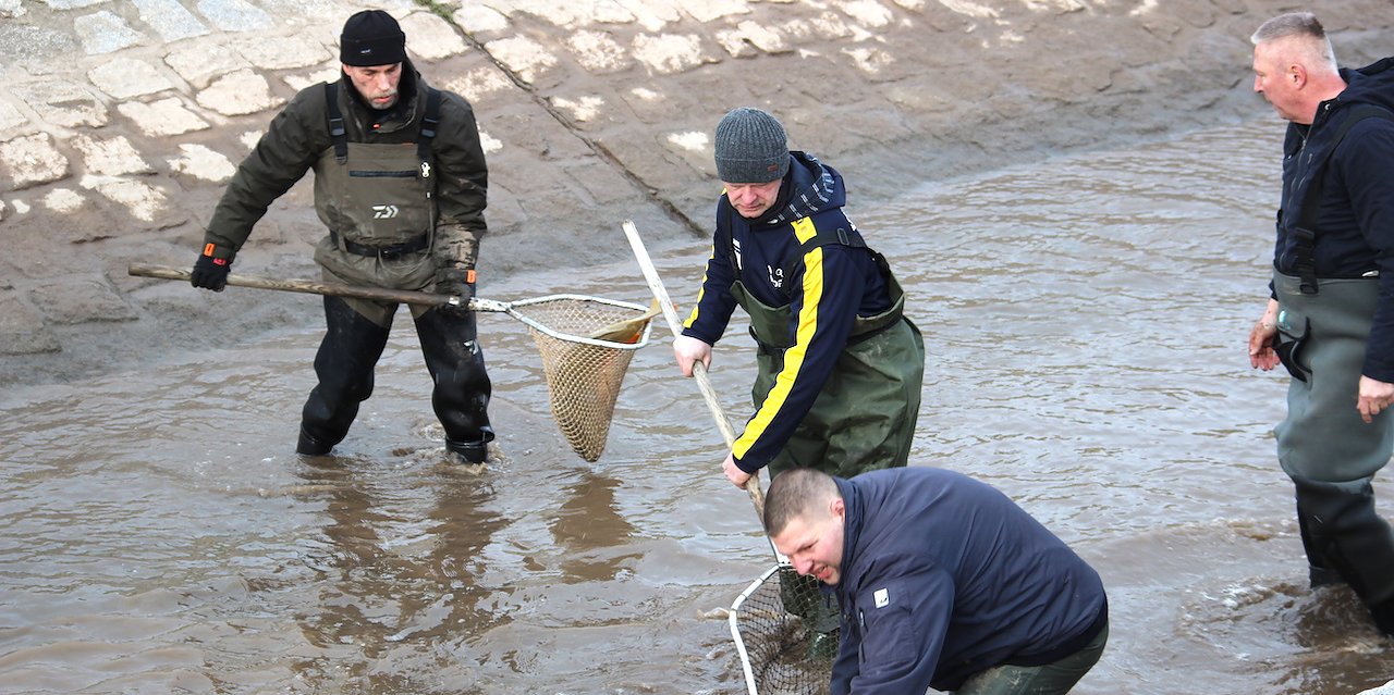 Ein Teil des Fischbestandes der Teichfische war schon vor der Austrocknung durch die starke Strömung in die Helme abgeschwommen. Frank Gabriel bedankt sich ganz herzlich bei den 12 Freiwilligen für ihre kurzfristige Hilfe und beim Talsperrenbetrieb für die Unterstützung, wodurch letztlich das Fischsterben verhindert werden konnte.