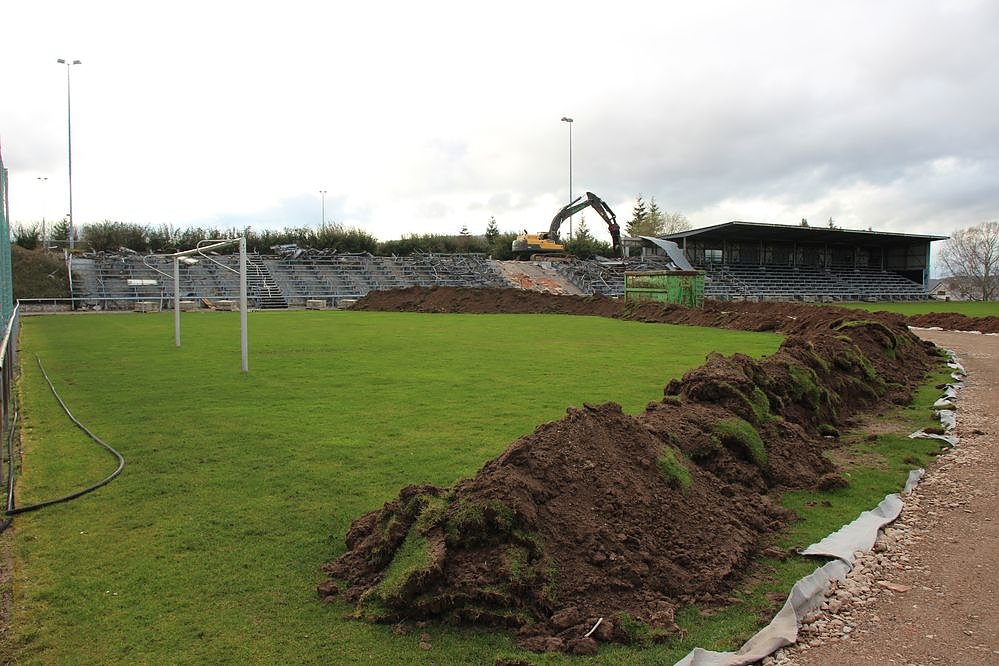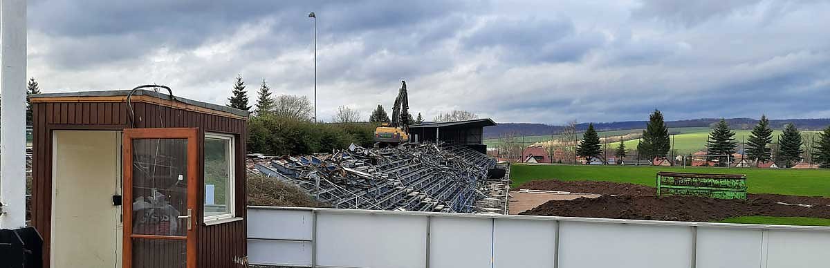 Autor: khhAm Samstag stand die Tribüne noch da, als kn den Göldner wegen eines Fußballspiel besuchte. Heute war schon über die Hälfte nur noch am Boden liegender Schrott.