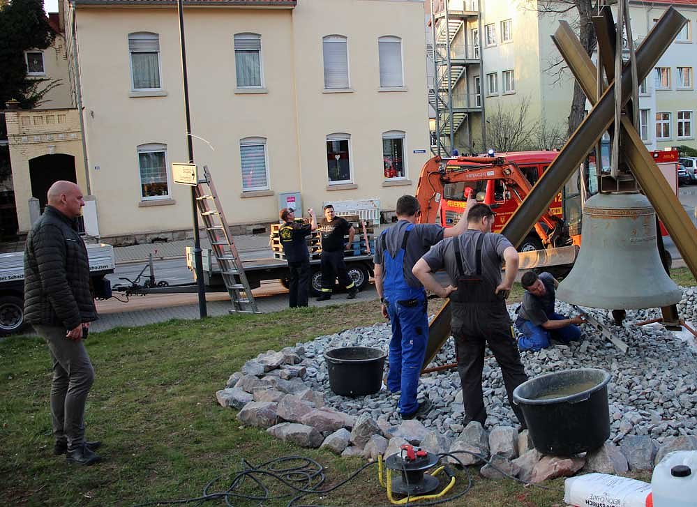 Nach Aufarbeitung in der Sondershäuser Metallbaufirma Lien GmbH wurde die Glocke heute mit Sicherung durch die Polizei und den Kameraden der Freiwilligen Feuerwehr Stockhausen an ihren endgültigen Standort gebracht. Hier soll die Glocke in der Güntherstraße als Mahn- und Gedenkort für die Bombardierung der Stadt Sondershausen dienen.