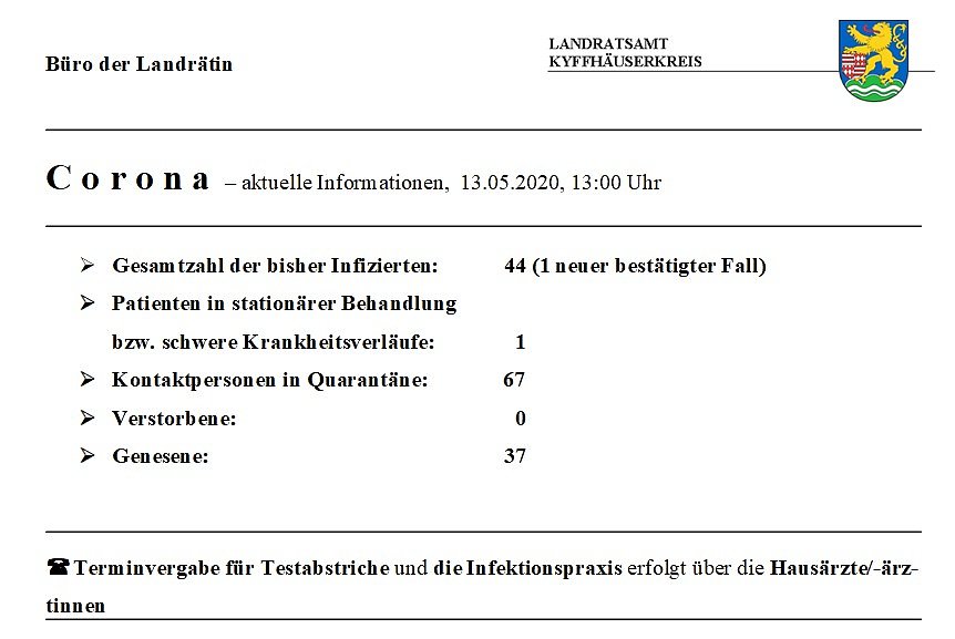 Hier die tägliche Meldung aus dem Landratsamt Kyffhäuserkreis verbunden mit einer Information aus dem Landratsamt zur Rechtsverordnung in Thüringen...