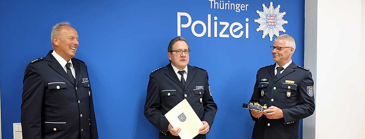 Die beiden Leiter würdigten die langjährigen Leistungen von Karl-Heinz Schmid bei der Thüringer Polizei. Heute war sein letzter Dienstag und das in doppelten Sinne denn es war auch der letzte Tag im Dienste der Polizei.