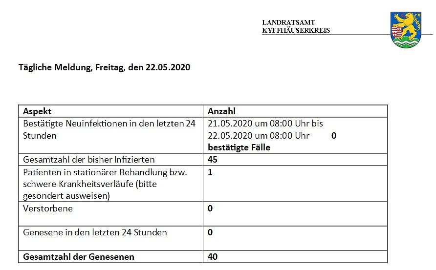 Hier die tägliche Meldung zu Corona aus dem Landratsamt Kyffhäuserkreis (ohne wesentliche Änderungen) und der Termin einer Sprechstunde mit Landtagsmitglied Babett Pfefferlein...