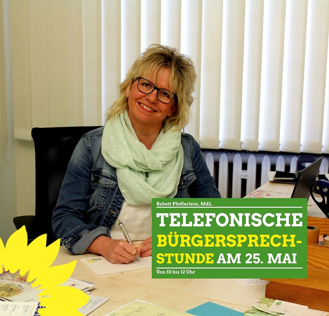 Babett Pfefferlein, Landtagsabgeordnete der Bündnisgrünen Fraktion, lädt Sie wieder herzlich zu einer telefonischen Bürgersprechstunde am Montag, den 25. Mai 2020, von 10 - 12 Uhr unter der Rufnummer 03631/6510596 ein. Gern können Sie sich vorab per E-Mail unter babett.pfefferlein@gruene-thl.de mit Ihrer Telefonnummer zur Bürgersprechstunde anmelden, um Wartezeiten zu vermeiden. Kommen Sie mit der gesundheitspolitischen Sprecherin zu Ihrem Anliegen ins Gespräch. Bleiben Sie gesund! Herzliche Grüße Babett Pfefferlein, MdL