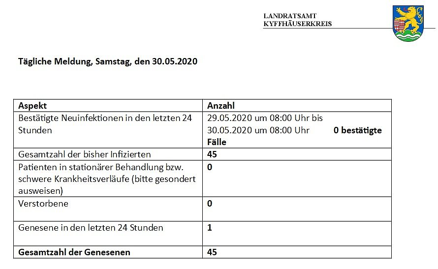 Hier die tägliche Meldung zu Corona aus dem Landratsamt Kyffhäuserkreis mit einer positvien Information...