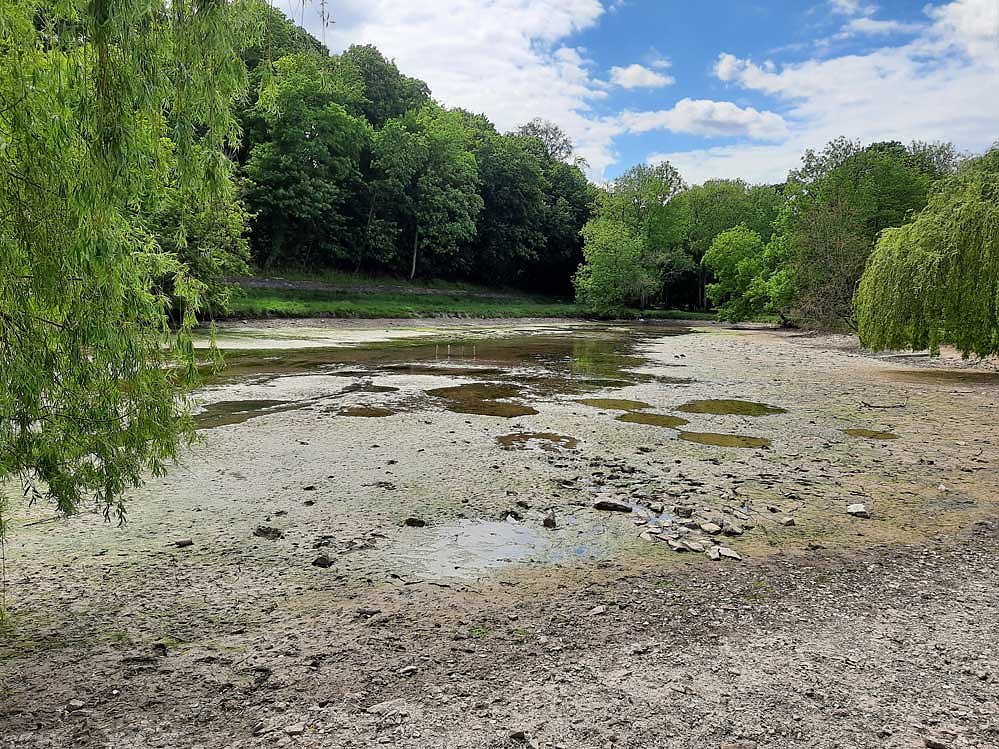 Das Plätschern am Überlauf zum großen Parkteich verrät, der Schieber wurde noch nicht repariert und der kleine Parkteich verliert leider fast so viel Wasser, wie gerade mal zuläuft. Damit bleibt es leider auch über Pfingsten bei dem unschönen Anblick.
