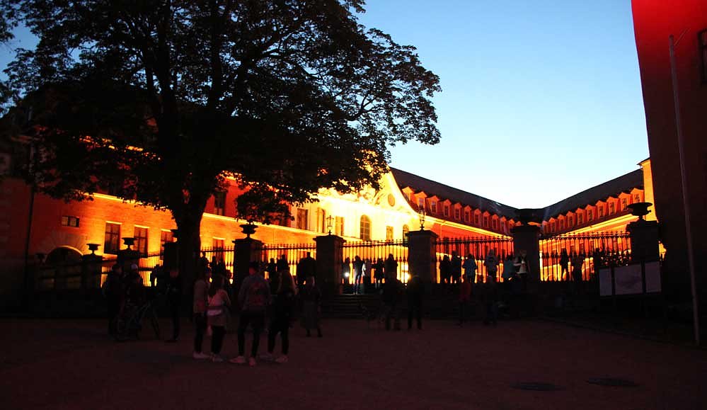 Vom Balkon aus war nichts zu erkennen. Welcher Balkon ist in Sondershausen so hoch, dass man in den Schlosshof blicken könnte. Und der Schlosshof öffnet sich ja auch nur in einer Richtung. Vielleicht vom Rondell her? Weder vom Markt her oder aus Richtung Schlossgalerie war kaum ein Lichtschein zu erkennen. Auch aus Richtung Hospitalstraße sah das Schloss in seiner Beleuchtung aus wie immer.