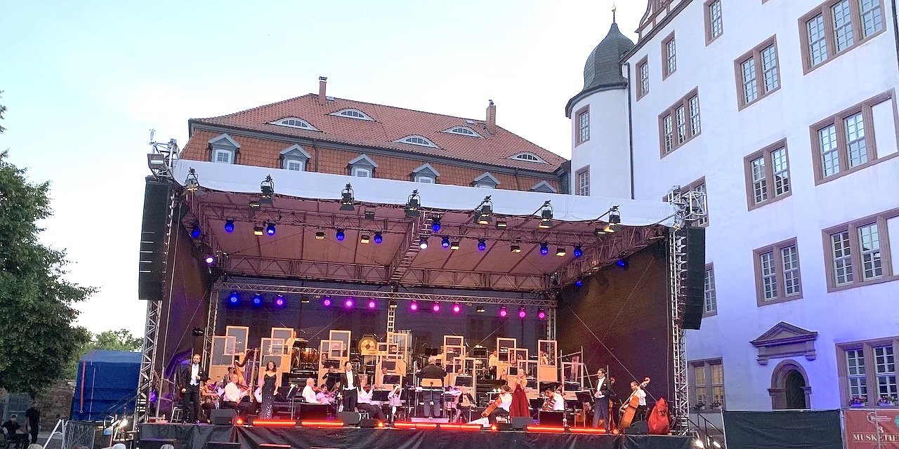 Autor: redMit den Solisten Amelie Petrich, Carolin Schumann, Thomas Kohl, Philipp Franke und Kyounghan Seo präsentierte sich am gestrigen Abend das Loh-Orchester Sondershausen auf der Bühne vor dem malerischen Schloss in Heringen. Die Bläser waren durch spezielle Trennwände voneinander und den anderen Kollegen abgegrenzt, auch sonst wurde genauestens auf die Einhaltung aller Corona-Vorschriften geachtet. Diese äußeren Umstände, die auch einen Einmarsch mit Masken auf der Bühne erforderlich machten, wurden jedoch von der Freude der Musiker, endlich wieder auftreten zu können und der Begeisterung der Zuschauer, endlich wieder Livemusik erleben zu können, aufgewogen. Ein gut aufgelegter GMD Michael Helmrath führte gewohnt witzig durchs Programm und besonders die Liebhaber der italienischen und französischen Oper dürften dabei voll auf ihre Kosten gekommen sein. Werke von Rossini, Donizetti, Puccini und Verdi standen im ersten Teil der Gala auf dem Programm, wobei insbesondere die vom koreanischen Tenor Kyounghan Seo vorgetragene Arie Nessun dorma aus Puccinis Turandot zu einem Höhepunkt des Konzerts avancierte.