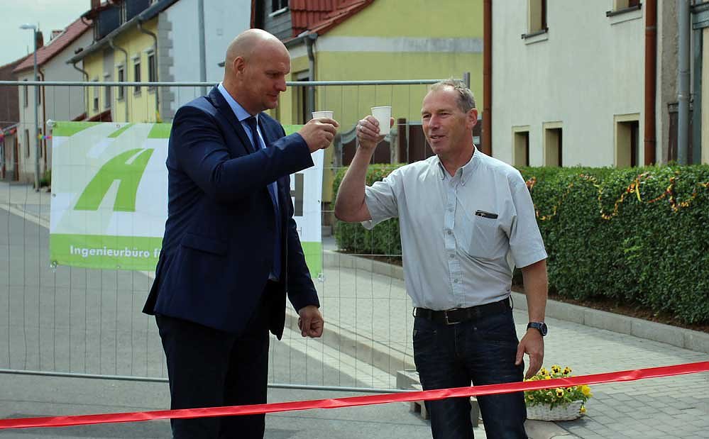 Bürgermeister Grimm bedankte sich bei den Bürgerinnen und Bürgern von Jecha für das aufgebrachte Verständnis für die Bauarbeiten. Schwarzbach: Wegen der schlechten Straßenverhältnisse und der Pfützen hatte der Fahrzeugverkehr öfter mal für derbe Spritzer an die Hauswände gesorgt, das sollte nun vorbei sein.