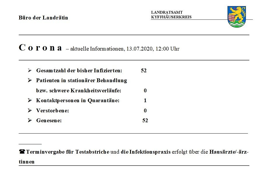 Hier die tägliche Meldung zu Corona aus dem Landratsamt Kyffhäuserkreis...
