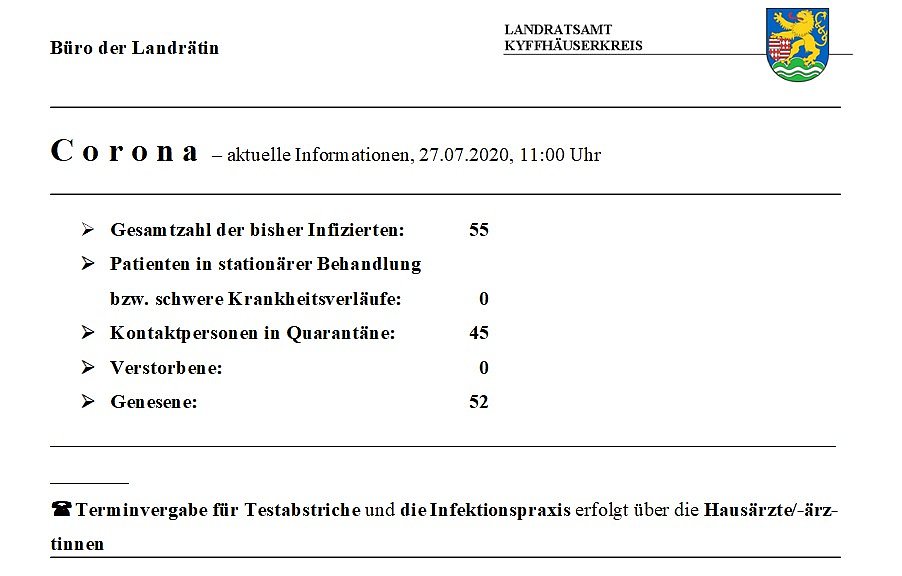 Hier der tägliche Bericht aus dem Landratsamt Kyffhäuserkreis zur Lage bei Corona...