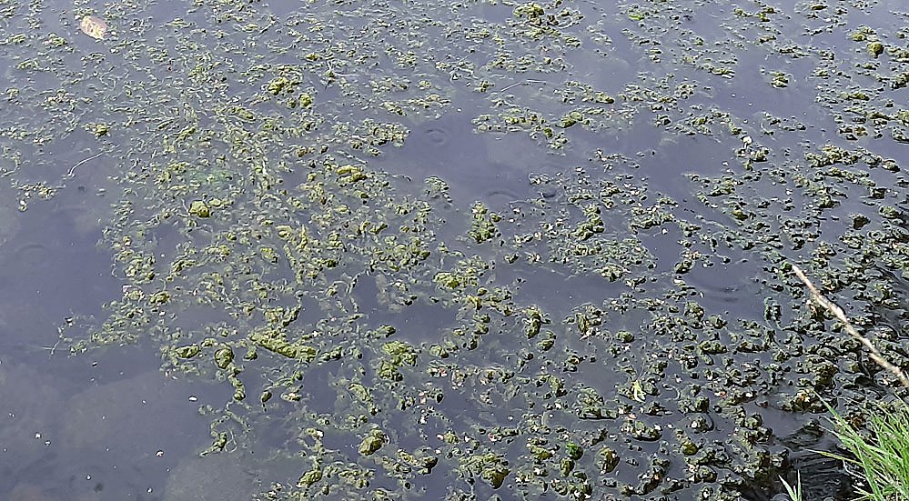 Die Temperaturen allein können den Algen- und Wasserpflanzenwachstum nicht erklären, denn auch in der Wipper als Fließgewässer sind solche Teppiche unterwegs.