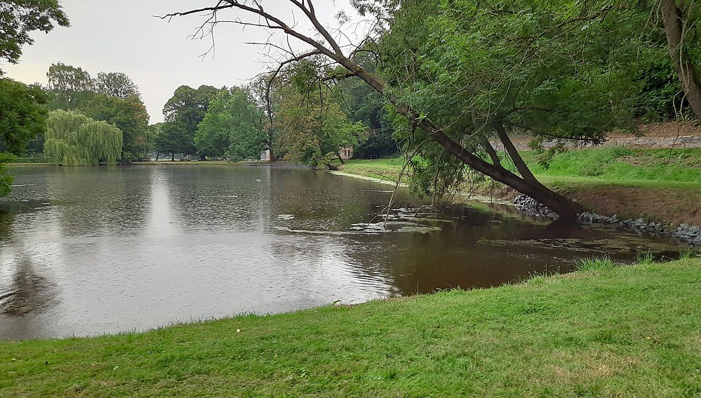 Im kleinen Parkteich hat sich nur ein minimaler Algen- und Wasserpflanzenteppich entwickelt. Und der Zufluss zum kleinen Parkteich ist seit den Sanierungsarbeiten so groß wie in den letzten Jahren nicht.