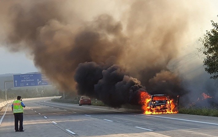 Kurz nach 19:00 Uhr machten aufmerksame Verkehrsteilnehmer auf der A 4 den Fahrzeugführer eines Pkw VW zwischen dem Hermsdorfer Kreuz und der Anschlussstelle Stadtroda in Fahrtrichtung Frankfurt/M. auf eine Rauchentwicklung an seinem Golf Plus aufmerksam. Daraufhin stellte er den VW auf dem Standstreifen ab und verließ ihn mit Frau und zwei Kindern unverletzt. Aufgrund eines Defekts im Motorraum breitete sich das dort entstandene Feuer schnell aus und griff auf das gesamte Fahrzeug über.