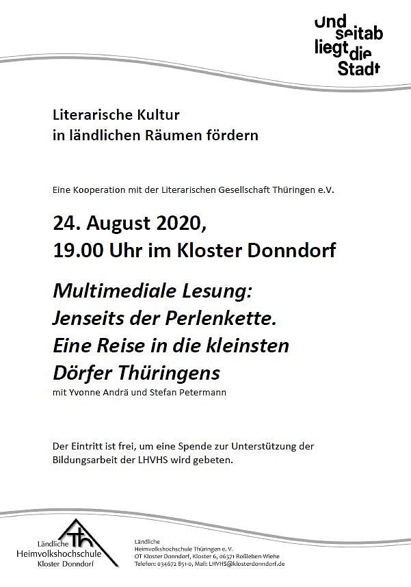 Am Montag, 24. August 2020 werden Yvonne Andrä und Stefan Petermann eine multimediale Lesung unter dem Titel Jenseits der Perlenkette. Eine Reise in die kleinsten Dörfer Thüringens gestalten. Die Veranstaltung findet in der Ländlichen Heimvolkshochschule (LHVHS) in Kloster Donndorf statt und beginnt um 19.00 Uhr, informiert Pfarrer Helfried Maas von der LHVHS.
