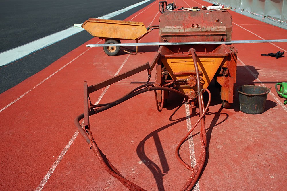 Mit dieser Spritzmaschine wird ein interessanter Arbeitsgang durchgeführt. Die ausgebesserten Kunststoffflächen der Leichtathletikanlage werden durch Aufspritzen mit einem neuen Belag beschichtet.