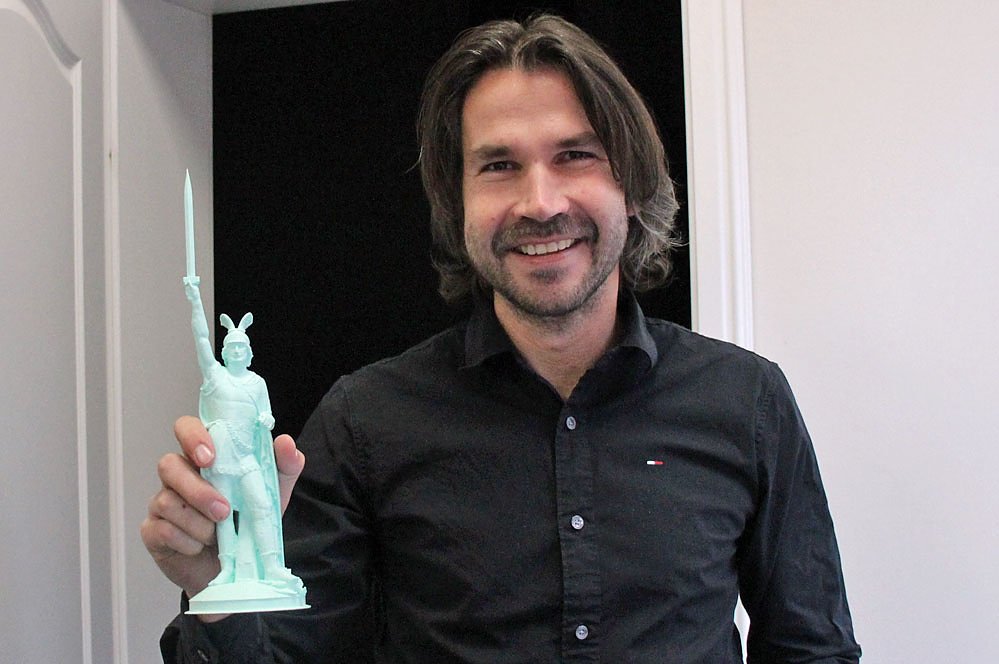 Hier präsentiert Thomas Zelmer das nächste Objekt. Nach umfangreicher 3D-Erfassung ist das Hermannsdenkmal bei Detmold nun auch originalgetreu als 3D-Druck erhältlich.