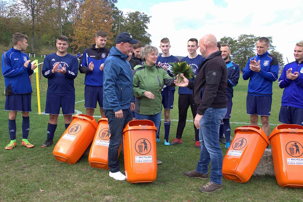 Autor: khhVor dem Spiel der 1. Mannschaft gegen Ebeleben überreichte der Geschäftsführer der S1-Recycling GmbH & Co.KG Sören Schäffer neue solide Papierkörbe an unseren Verein.