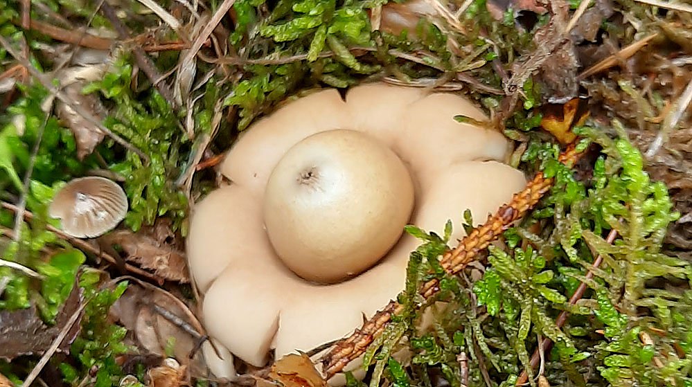 Der große Pilz soll ein Rötender Erdstern, Rotbrauner Erdstern sein, aber da bin ich mir nicht so sicher. Es war aber weit und breit das einzige Exemplar dieser Art. Aber ob das so stimmt? Ausgraben wollte ich den Pilz nicht, nur um zu sehen, wie er unten aussieht.