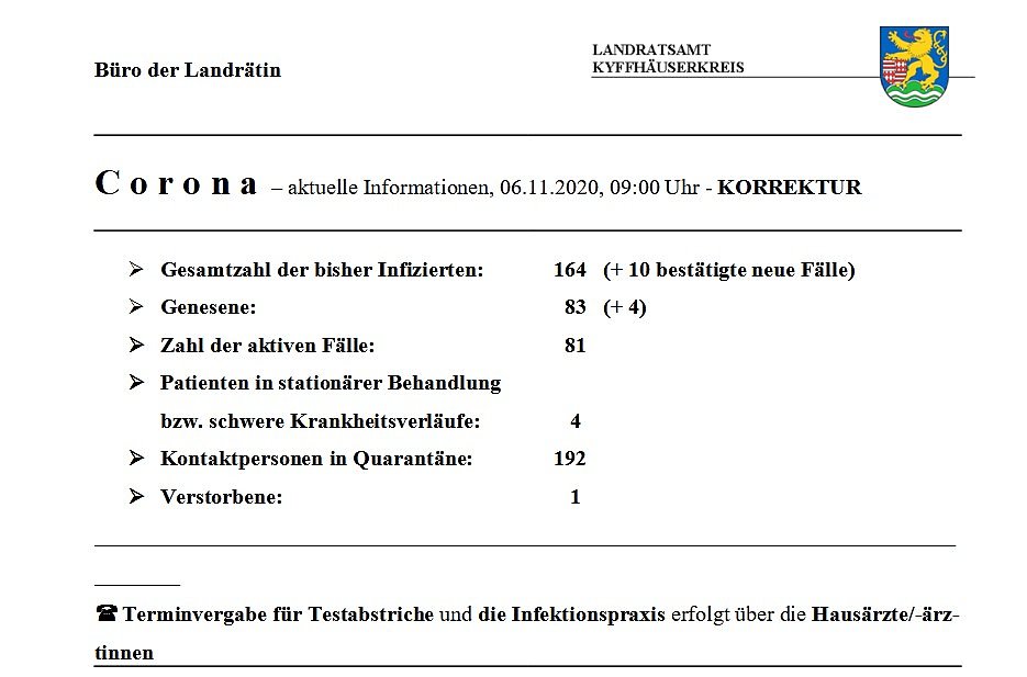 10 weitere Fälle / erneut 4 Personen genesen / der 1. Todesfall im Kyffhäuserkreis