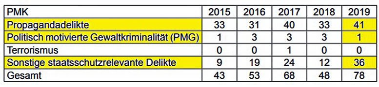 Neben den Propagandadelikten bestimmen die Sonstigen staatsschutzrelevanten Delikte die Statistik. Hierunter versteht man zum Beispiel Sachbeschädigungen und Volksverhetzungen. Das Niveau der PMK rechts lag im letzten Jahr auf dem Niveau der Vorjahre. Anders bei der PMK links, hier ist ein starker Anstieg in 2019 zu verzeichnen. In der Konsequenz waren dem Tatumfeld links doppelt so viele Delikte zuzuordnen wie dem Tatumfeld rechts.
