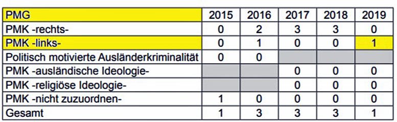 Unter den Kriminalitätsarten ist Gewaltkriminalität (PMG) sicherlich diejenige mit den größten Auswirkungen auf den Bürger. Der einzige Vorfall diesbezüglich wird dem linken Spektrum zugerechnet (Bild 5).