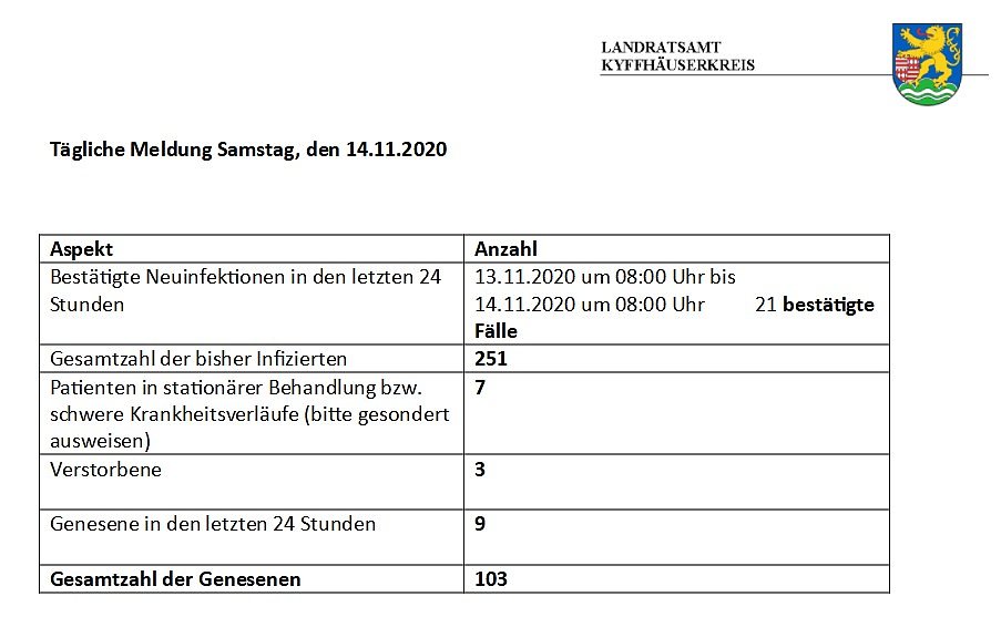 Die Meldung ist, wie der Screenshot zeigt, vom 14.11.2020 und gibt den aktuellen Stand per 08:00 Uhr an. Diese Meldungen des Landratsamtes erscheinen täglich in den Kyffhäuser Nachrichten.