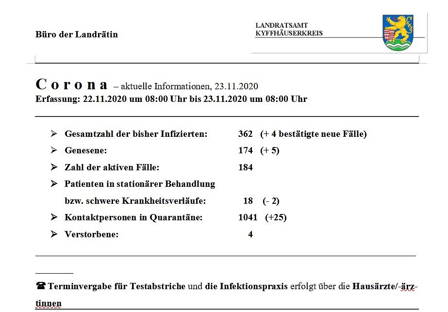 Hier die tägliche Corona-Meldung aus dem Landratsamt Kyffhäuserkreis...
