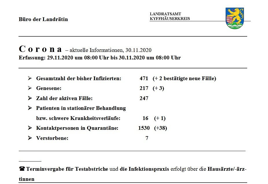 Deutlich weniger Infektionen gemeldet. Hier die tägliche Corona-Meldung aus dem Landratsamt Kyffhäuserkreis...
