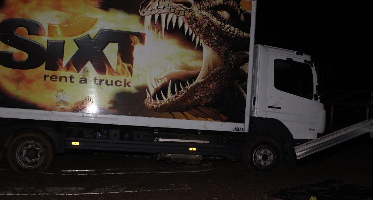 Zu einem Abtransport kam es nicht, so dass der Lkw am Tatort zurückblieb. Bei dem benutzten Fahrzeug handelt es sich um einen Mercedes Atego der Autovermietung Sixt.