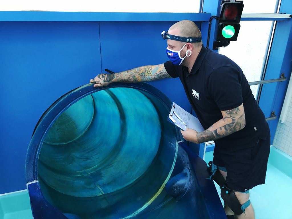 Die Zeit des Lockdowns wird aber nicht nur für die Wartung von Spielplätzen und ihren Geräten genutzt, auch viele Betreiber von Hallenbädern lassen die Chance nicht ungenutzt verstreichen und ziehen die jährliche Wasserrutschenprüfung vor. So können mögliche Mängel noch vor dem ersehnten Saisonbeginn abgestellt werden.