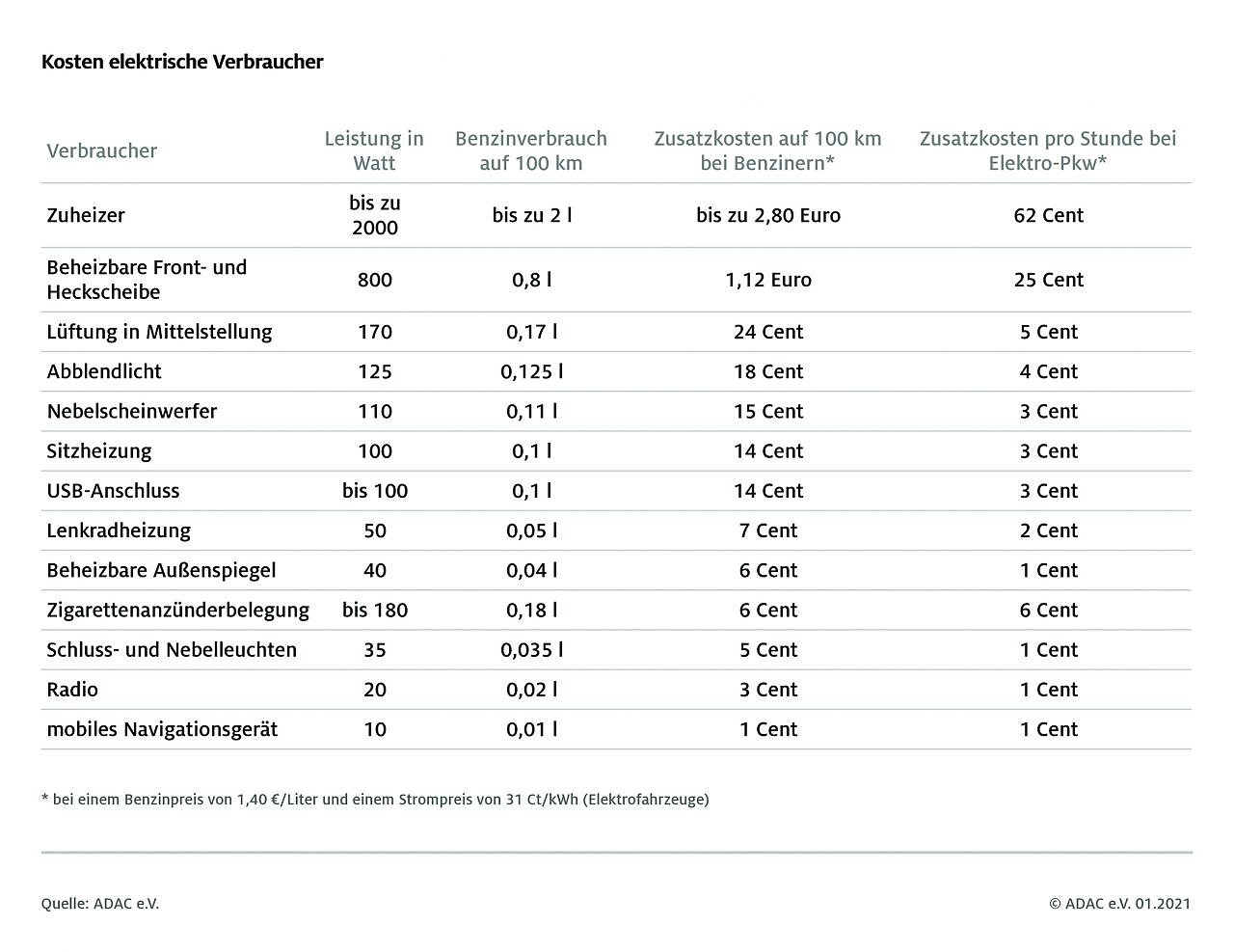 Sind beispielsweise die Heizaggregate für Frontscheibe (800 Watt), Sitz (100 Watt), Lenkrad (50 Watt) und Außenspiegel (40 Watt) aktiv und gleichzeitig lädt das Handy (10 Watt), verteuert sich eine Fahrt von München nach Frankfurt auf den rund 400 Kilometern für Benziner um fast 6 Euro bzw. rund 1,25 Euro für Stromer.