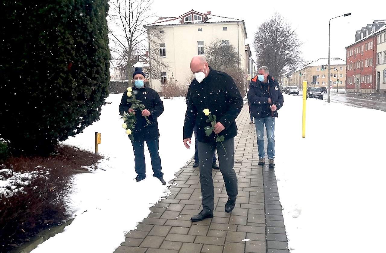 Coronabedingt wurden nur wenige Gäste dazu geladen, die zudem den erforderlichen Abstand zueinander hielten. Organisiert wurde die Veranstaltung, an der auch Bürgermeister Steffen Grimm teilnahm, vom Allgemeinen Behindertenverband. Die Erinnerungsrede hielt der Landtagsabgeordnete Stefan Schard, CDU.