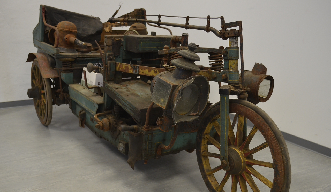Nach der Überstellung aus Sachsen, begannen sofort die Recherchen zur Geschichte dieses zweisitzigen Fahrzeuges mit den Abmessungen L- 2,0 m, B- 1,0m, H- 0,8m. Namhafte Museen in Deutschland wurden angeschrieben und um mögliche Hinweis auf den Ursprung des Fahrzeuge zu erhalten. Leider ohne ein zielführendes Ergebnis.