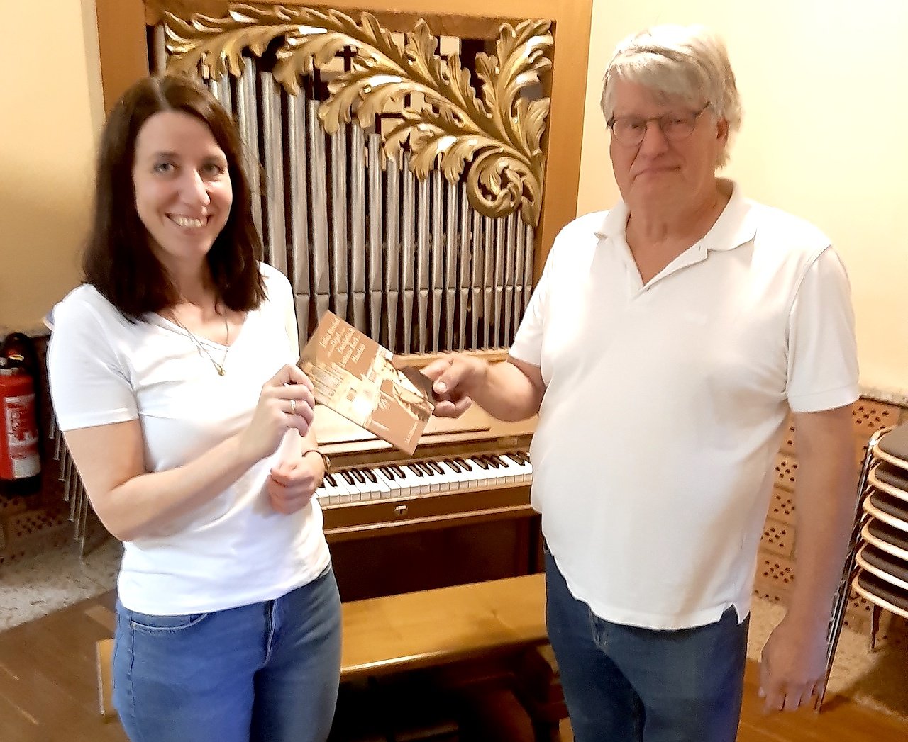 Kantorin Laura Schildmann und Orgelbauer Sicco Steendam bei der Übergabe der Festschrift an der Kleinen Strobelorgel" (Foto: Stadtverwaltung Bad Frankenhausen)