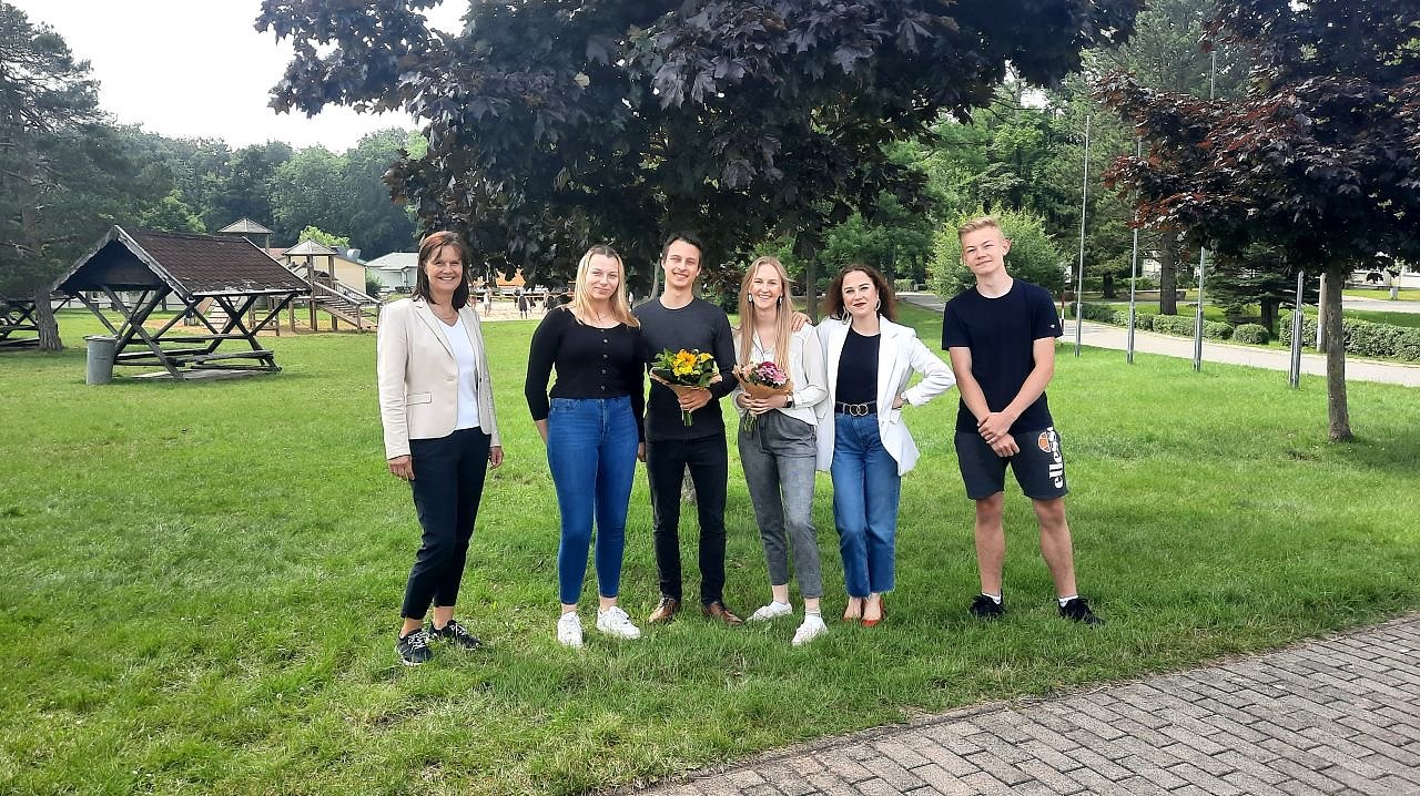 1.v.l. Landrätin Antje Hochwind-Schneider (SPD); 4.v.l. Tanja Henze (gewählte Vorsitzende Jugendparlament); 3.v.l. Kevin Balßuweit (Stellvertreter) (Foto: Landratsamt Sondershausen)