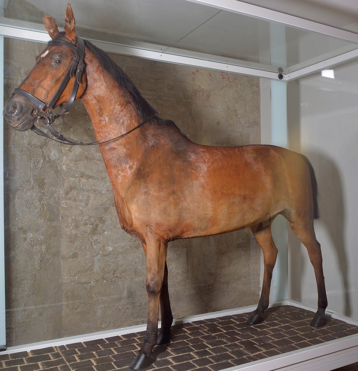 Die Geschichte des ausgestellten Tieres reicht bis in das 19. Jahrhundert zurück. In den Inventarunterlagen des Fürstlichen Marstalls aus dem Jahre 1886 findet sich ein Eintrag über dieses Präparat, wo es als ausgestopftes braunes Pferd erwähnt wird. Danach war es an verschiedenen Orten im Schlossbereich aufgestellt. Eine historische Postkarte aus den 1920er Jahren zeigt das Pferd im Riesensaal des Schlosses.
